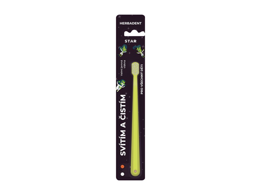 HERBADENT STAR toothbrushes have very soft bristles and are made of phosphorescent material that glows when illuminated.
